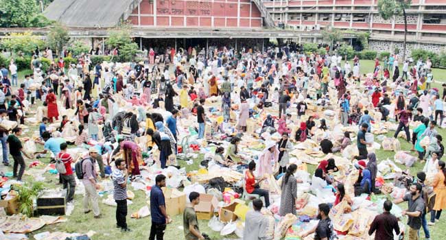 ত্রাণ সামগ্রী নিয়ে আসা মানুষের এতোইটা চাপ যে টিএসটি এলাকায় যানচলাচল প্রায় বন্ধ হয়ে যায়। ত্রাণসামগ্রীতে পূর্ণ হয়ে গেছে টিএসটি। এখানে ঠাঁই নেই বলে এখন বিশ্ববিদ্যালয়ের কেন্দ্রীয় খেলার মাঠে চালু হয়েছে ত্রাণসামগ্রী গ্রহণ কার্যক্রম। শনিবার রাতে এই সিদ্ধান্ত নেওয়া হয়।