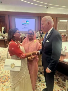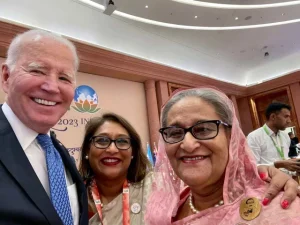 বাংলাদেশের প্রধানমন্ত্রী শেখ হাসিনার সঙ্গে সেলফি তুলছেন যুক্তরাষ্ট্রের প্রেসিডেন্ট জো বাইডেন, সঙ্গে সায়মা ওয়াজেদ পুতুল।