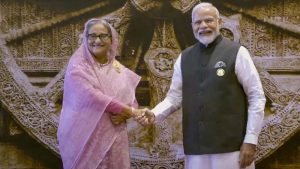 শনিবার সকালে জি-২০ সম্মেলনে যোগ দেন প্রধানমন্ত্রী শেখ হাসিনা। এসময় ভারতের প্রধানমন্ত্রী নরেন্দ্র মোদি তাকে অভ্যর্থনা জানান। ছবি: পিটিআই