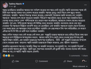 ফেসবুকে দেওয়া তসলিমা নাসরিনের পোস্ট